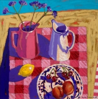 After Bournville School of Art, British artist painter Sara Hayward MA (RCA) studied at the Ruskin School of Drawing & Fine Art, Oxford University, and printmaking at the Royal College of Art, London. Her vibrant, colour filled paintings principally include still life seascape, figurative and landscape subject matter. Printmaking informs Sara’s painting process and the layering of vibrant mark making with a heightened colour palette create a unique and personal semiabstract response to her chosen subject matter. She likes to work in series on families of paintings exploring expressive mark making techniques as can seen with her still life genre and Iona inspired seascapes. At the outset of each new image on paper Sara is passionate about exploring composition, structure, drawing and spatial devices with the most successful reworked onto board.